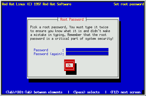 You ought to make the root password something you can remember, but not something that is easy for someone else to guess. Your name, your phone number, qwerty, password, root, 123456, and anteater are all examples of poor passwords. Good passwords mix numerals with upper and lower case letters and do not contain dictionary words: Aard387vark or 420BMttNT, for example. Remember that the password is case-sensitive. Write down this password and keep it in a secure place.