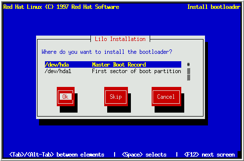 Please Note: If you choose Skip, you will not be able to boot your Red Hat Linux system directly, and will need to use another boot method (such as a boot diskette). Use this option at your own risk!