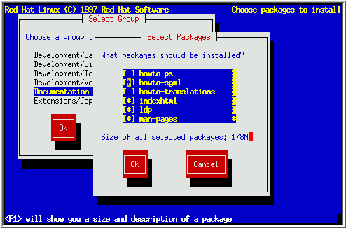 After selecting the components you wish to install, you may select or deselect individual packages. The installation program presents a list of the package groups available; select a group to examine and press [Enter]. The installation program presents a list of the packages in that group, which you may select or deselect using [Space] (see Figure 30). You may view a detailed description of a package by pressing [F1]. When you are finished selecting individual packages, press OK in the Select Group dialog box.